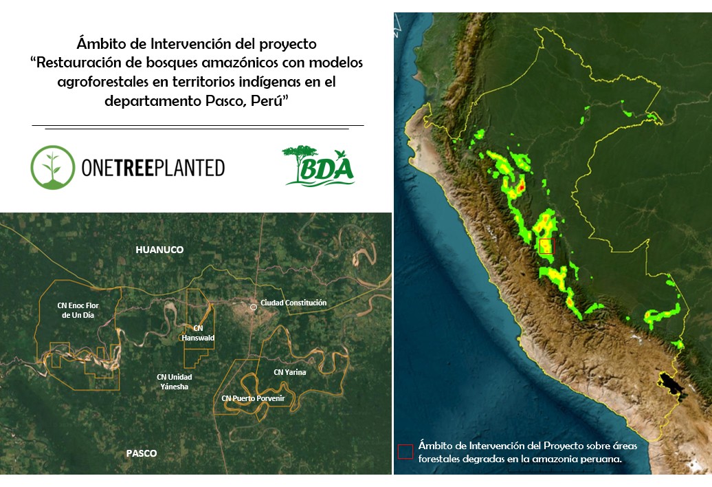 Con soporte de One Tree Planted, BDA impulsa la recuperación de ecosistemas forestales degradados en bosques comunales en el distrito Constitución, del departamento Pasco, en la amazonia peruana, revalorando la importancia de los árboles para combatir la crisis climática, mejorar la capacidad productiva de suelos, conservar biodiversidad, resguardar patrones culturales; así mismo, generar iniciativas económicas sostenibles, facilitando la participación de población indígena en procesos de desarrollo local.